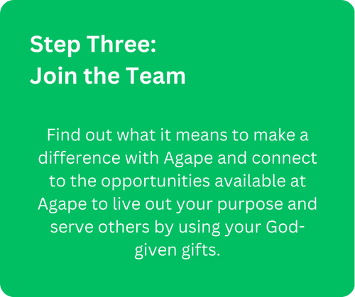 Growth Track is new to Agape, but is designed to help you become a fully-devoted follower of Jesus Christ. From the initial decision to find out more about the vision of Agape to a fulfilling leadership role on our team, we will provide you with a path to experience growth and fulfillment.